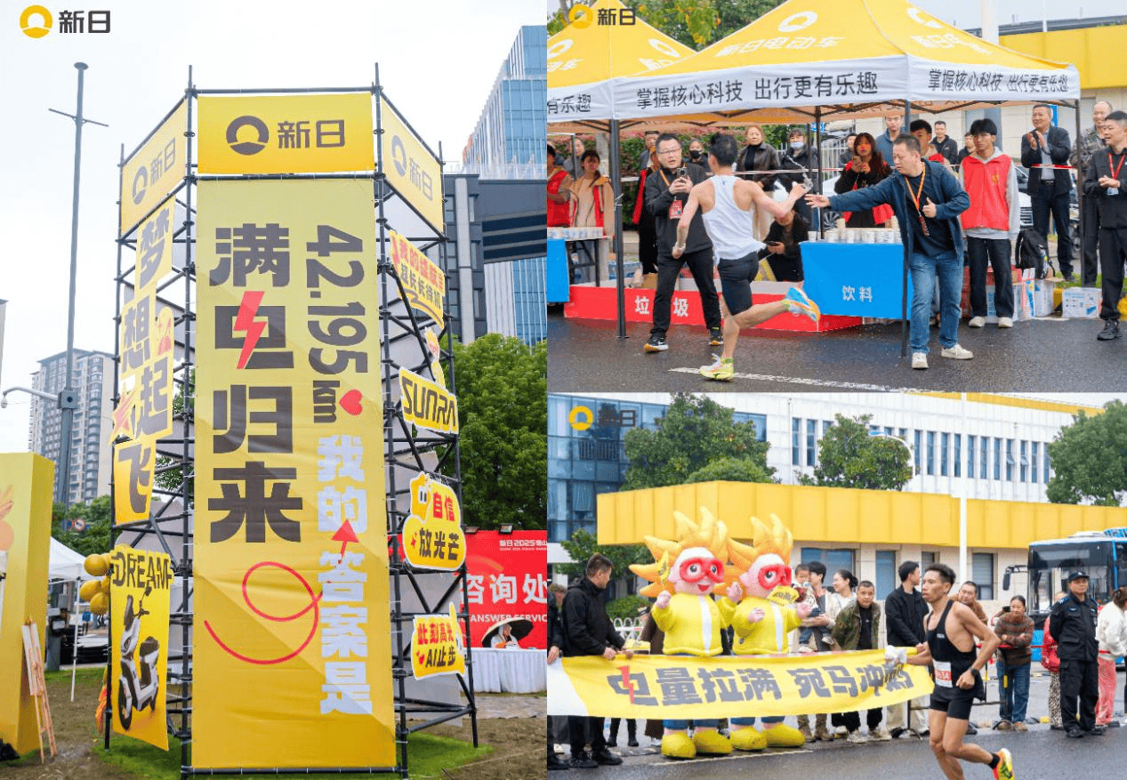 在赛程中段,新日设置的补给点成为选手们突破体能极限时的“充电桩”。“满电归来”、“梦想起飞”的应援标语、活力四射的小新与志愿者们,共同组成一片鼓舞人心的“新日黄”氛围阵,为每一位经过的跑者注入向前动力。