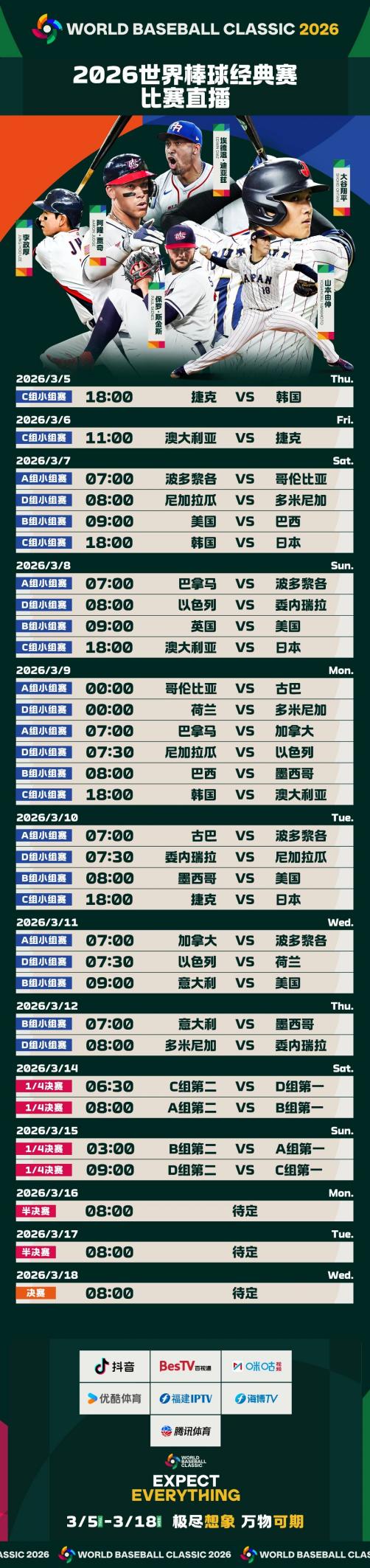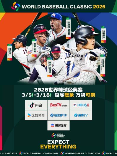 备受瞩目的第六届世界棒球经典赛 (World Baseball Classic) 今日拉开了序幕!2026年3月5日至3月18日,这项代表全球最高水平的国际棒球赛事将汇聚起来自世界各地的顶尖好手,为广大球迷献上热血澎湃的巅峰对决。本次赛事将在抖音、百视通、咪咕视频、优酷体育、福建IPTV、海博TV和腾讯体育线上多平台同步直播,同时3月5日至3月10日东京小组赛期间,MLB将在国内15个城市举办共计40余场线下观赛趴活动。这场四年一度的体育盛会,必将再次点燃全球各地棒球迷的激情。